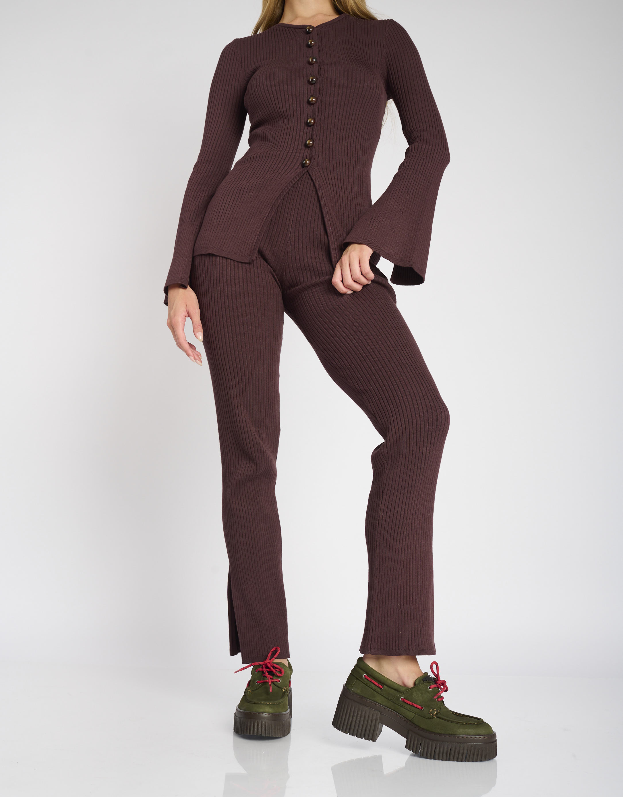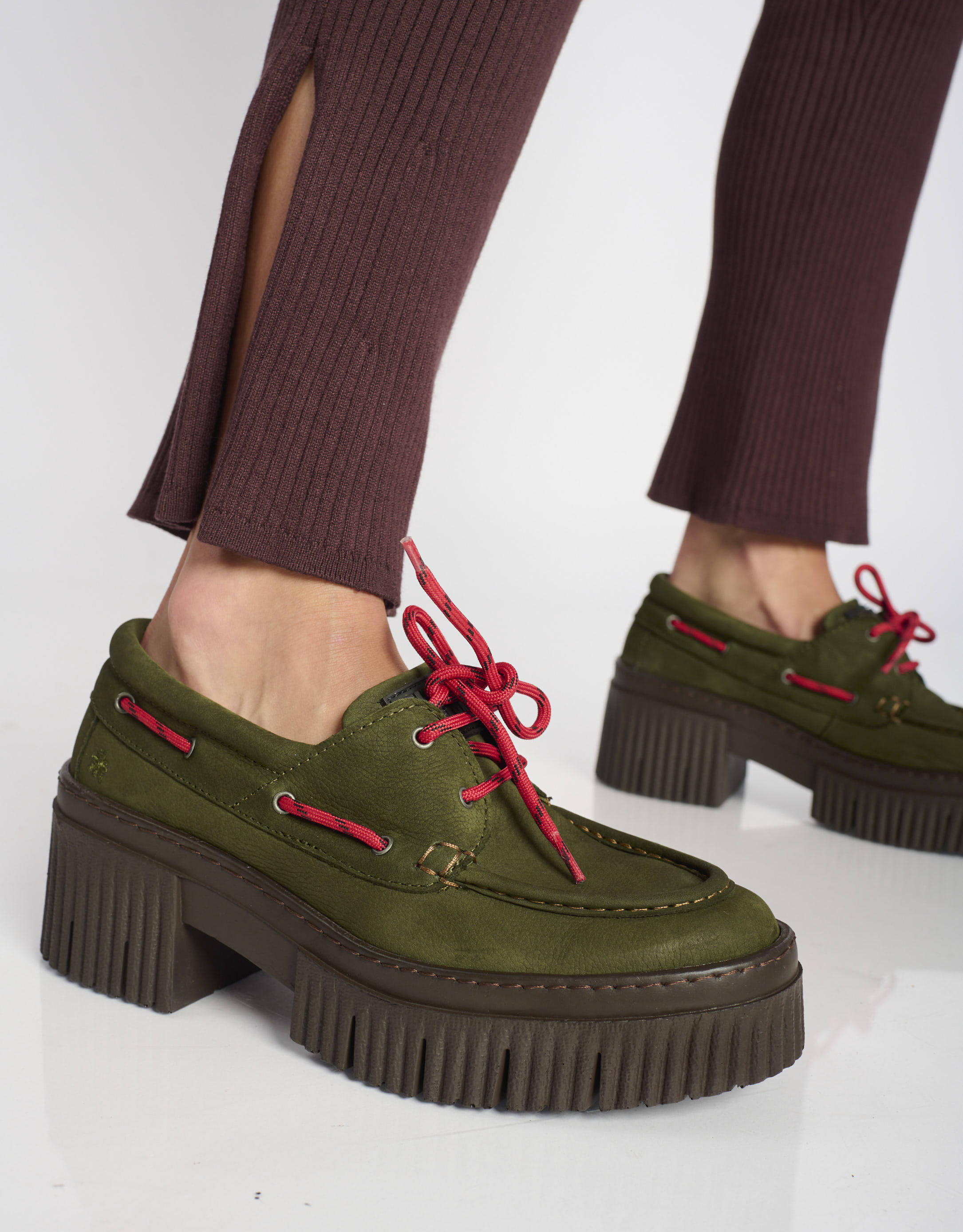 מוקסינים מעור עם סוליית פלטפורמה צ'אנקית, שרוכים בולטים וגימור מלוטש.