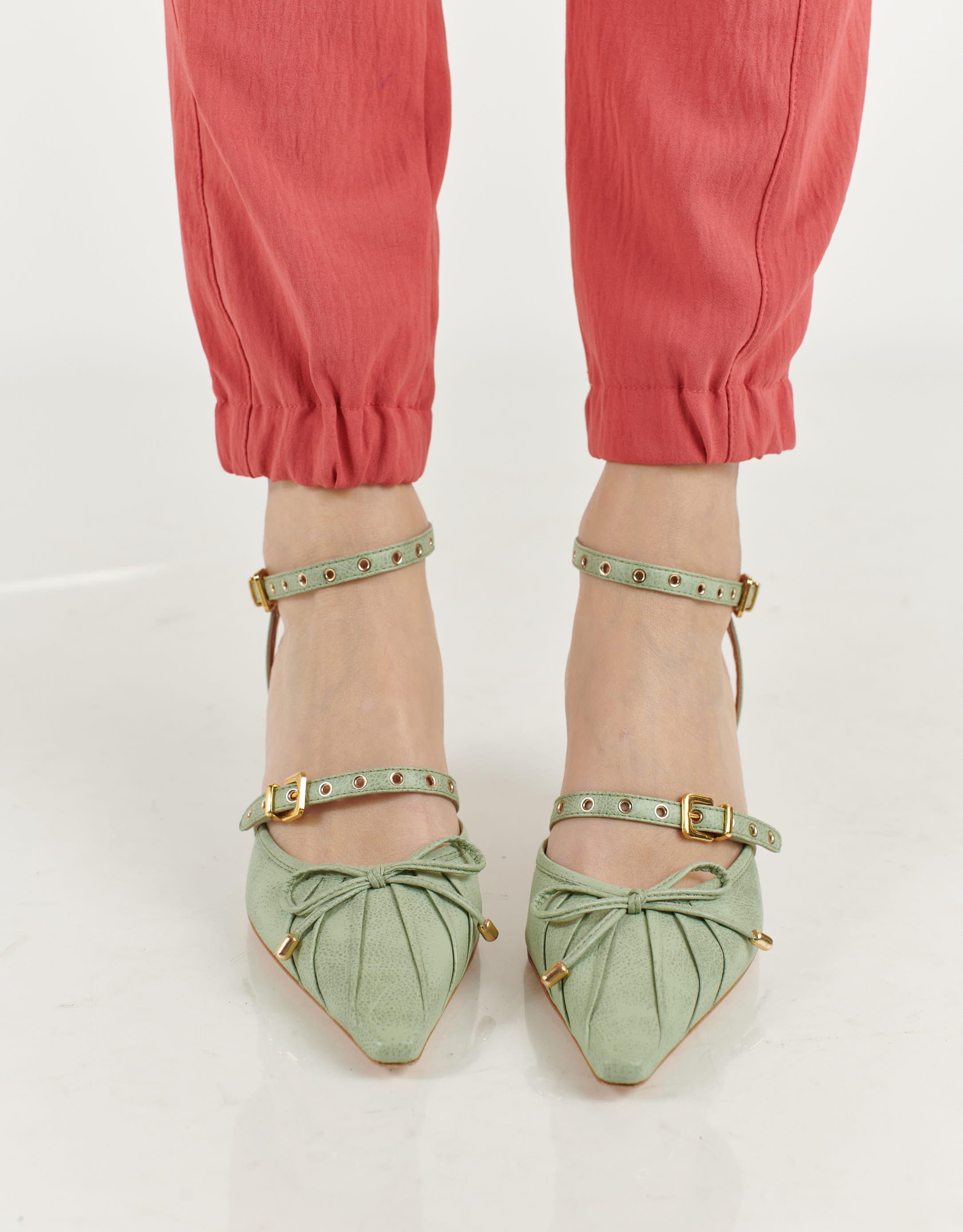 נעליים קלאסיות עם עקב עדין, דיטייל בפרונט ומראה וינטג'. נעלי שפיץ בעלות סוליית עור איכותית ומיוצרות בעבודת יד.