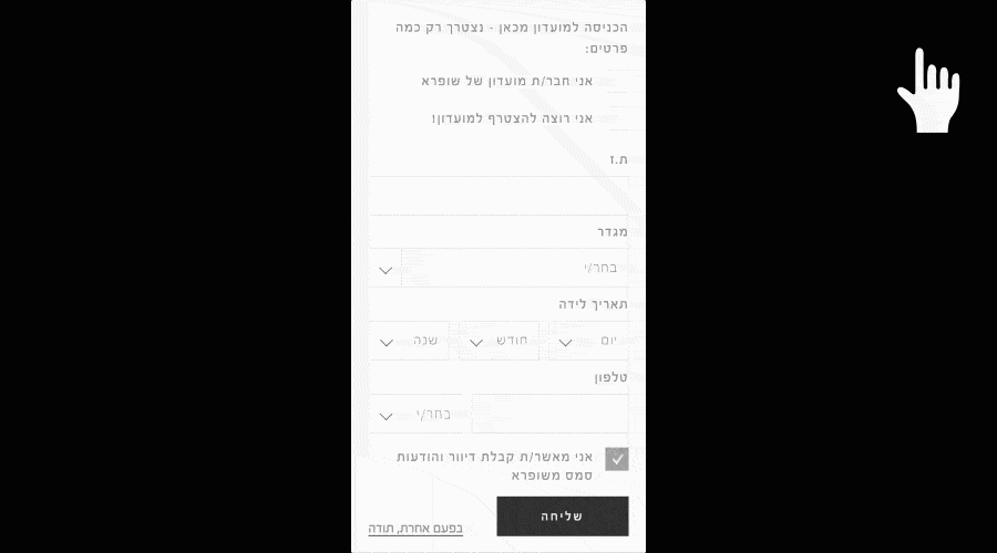 גם אם קניתם/ן אצלנו בעבר, בחנויות או כאורח/ת באתר – כדי להתחבר לאתר ולמועדון, נדרשת הרשמה ראשונית.